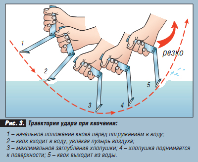 При опускании квока нужно делать движения не очень медленные, иначе звук не получается совсем, и не очень быстро, чтобы не было простого шлепка по воде с брызгами. Поэтому в движении руки участвует только локтевой сустав без задействования плечевого.