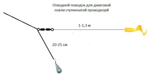 Чтобы поводок не скручивался во время проводки, рекомендуют устанавливать дроп-шот, представляющий собой леску с концевым грузом в форме шарика либо груши. Отводной поводок крепят к тройному вертлюжку, привязывают грузила.