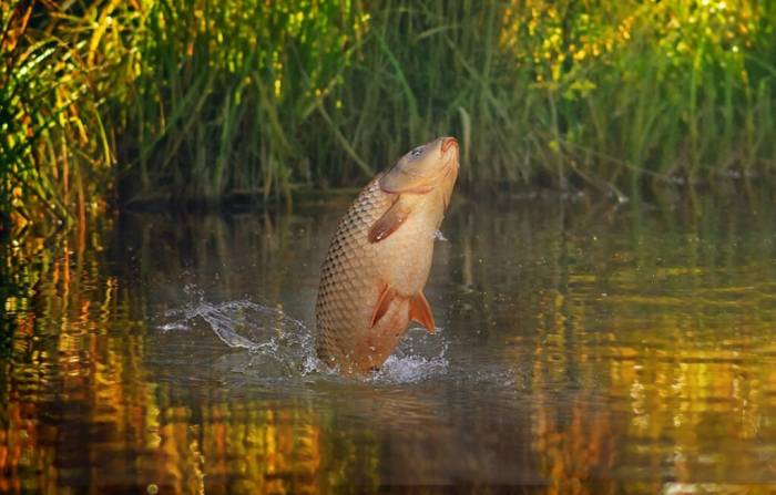 Голодный сазан часто выдает свое местонахождение интенсивными выпрыгиваниями над поверхностью воды. Если вам удалось заметить такое явление, можно раскладывать снасти и приступать к ловле.