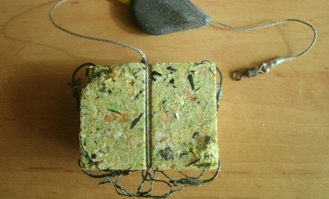 Главным действующим элементом в оснастке является кусочек прессованного подсолнечного жмыха. Он делается в форме прямоугольного параллелепипеда или куба. Размер приманки составляет 4-6 см.