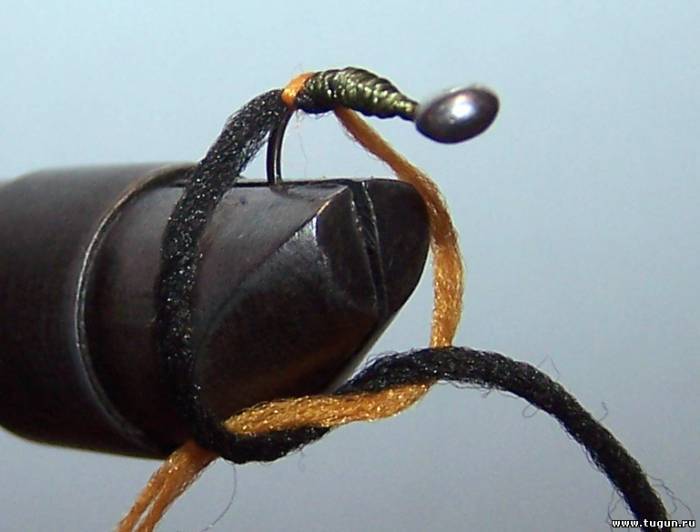 - Из петушиного пера формируется хвостик и фиксируется нитью на всем протяжении цевья, излишки обрезаются.