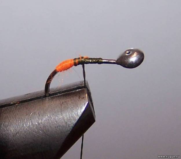 Поочередно обматывайте закрепленный тисками крючок необходимыми элементами