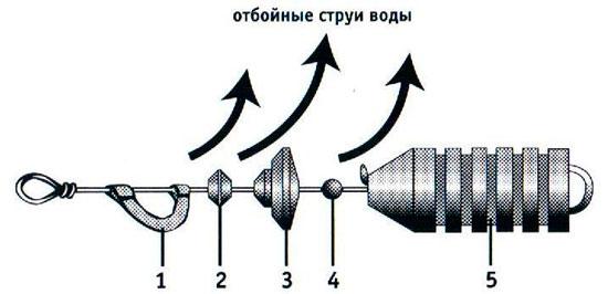 Есть конструкции, собранные на одном проволочном каркасе: жестко впаянное в стержень грузило, за ним непосредственно вертушка, и лишь последующий тройник крепится шарнирно на хвостовой петле или застежке. Такая конструкция не очень эффективна, так как пригодна лишь для равномерной проводки, да и обидными захлестами частенько грешит.