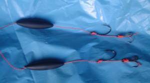 - через 15 см от грузила привязывается сначала один двойной крючок, а через небольшое расстояние — второй;