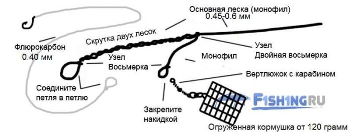 - через 15–20 см от крючка к леске с помощью петли крепится карабин.