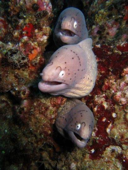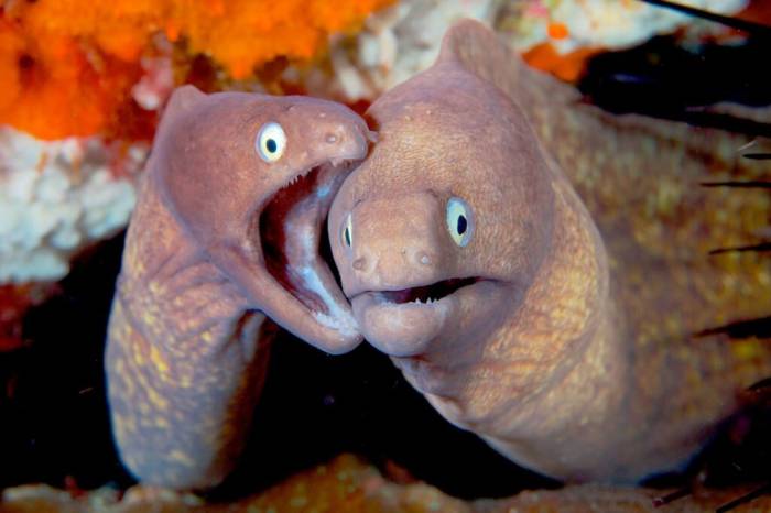 Как правило, мурены не проявляют агрессию друг к другу и не являются территориальными животными. Они спокойно уживаются в соседних убежищах, не чувствуя конкуренции.