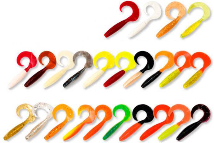 Из огромного разнообразия расцветок подобрать наиболее подходящую сложно. Есть мнение, что цвет твистера не должен напоминать рыбе малька, поэтому чаще используют темные тона, соответствующие личинкам, ракообразным и насекомым, обитающим возле водоемов.