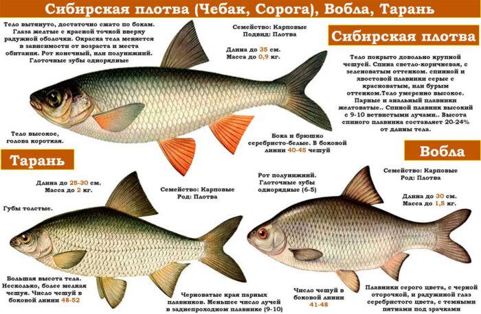 На Урале плотву называют чебаком или сорогой. Отличия не только в названии. У чебака более приплюснутое по бокам туловище, а у других представителей карповых оно широкое. Иногда эту рыбу путают с красноперками. Различается цвет глаз – у красноперки он оранжевый с красным пятнышком на радужной оболочке. Также на спинных плавниках меньше перьев.