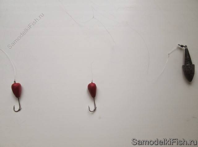 Груз нужно подбирать в зависимости от волнения моря и рельефа дна, но нельзя пользоваться простой каплей, так как она может перекрутить снасть, волочась по дну. Первый поводок нужно привязать на расстоянии примерно в 25-30 см от грузила, второй – примерно на таком же расстоянии.