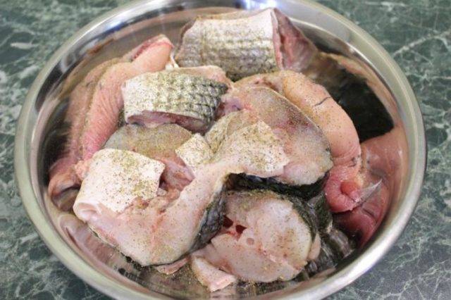 - Рыба чистится, разделывается и моется, как и в первом случае, после чего режется на порционные куски.