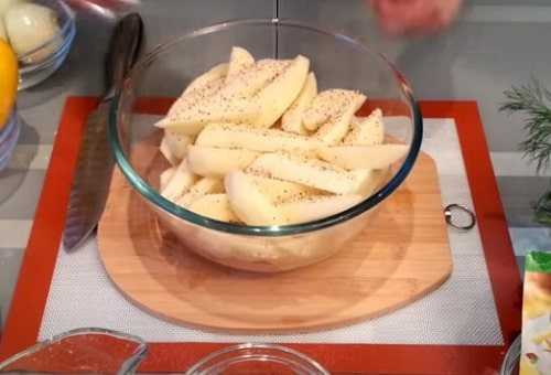 - Картофель применять в форме пластинок, толщина которых не более сантиметра. Овощ присыпать перцем, посолить, перемешать.