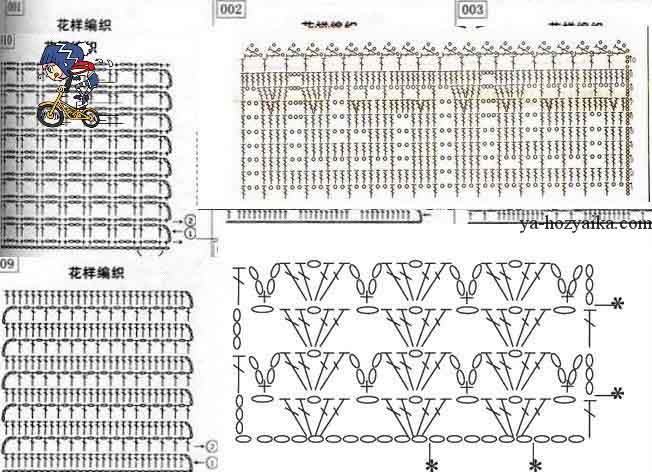 Обратите внимание на условные обозначения, представленные в схеме: столбики с 1, 2 и 3-мя накидами хорошо и четко видны, а те, на которых жирные линии – это патентные столбики, они чуть выше, чем столбик с 1 накидом и ниже с2н. Такой прием нужно обязательно выполнять, чтобы клеточка получалась ровной квадратной.