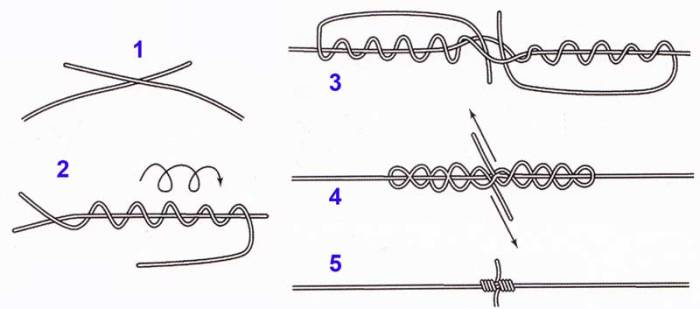 - После протягивания в противоположные стороны ходового и коренного концов петля узлового соединение будет склонна к свиванию. Таким образом, образуется несколько витков. Стоит отметить, что направленность свивания петли будет противоположной созданию шлагов.