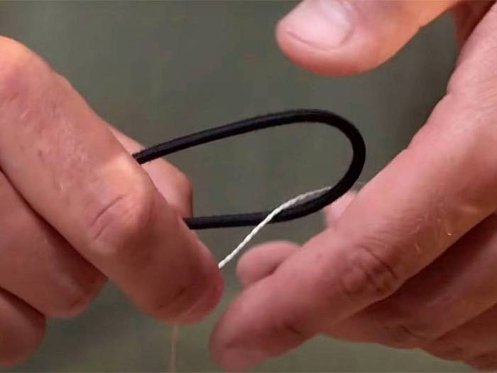 На нашем шнурке шок-лидере делаем петлю и продеваем в эту петлю тонкую веревочку, которая у нас за место основной лески;