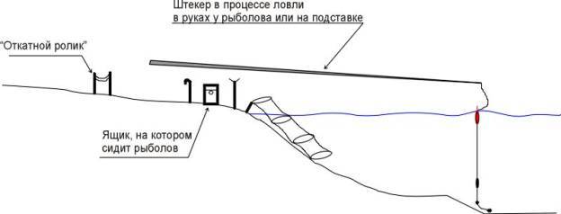 Ловля на штекерное удилище начинается с того, что рыболов вначале устанавливает ящик и большинство принадлежностей, в частности, откатной ролик, зажимную стойку, подставки для китов, держатели удочки. После этого можно приступать к сборке снасти. По окончании рыбалки сначала нужно разобрать снасть, а уже затем прочее оборудование. Так удастся избежать неприятностей в виде поломки верхнего колена или удлинителей.