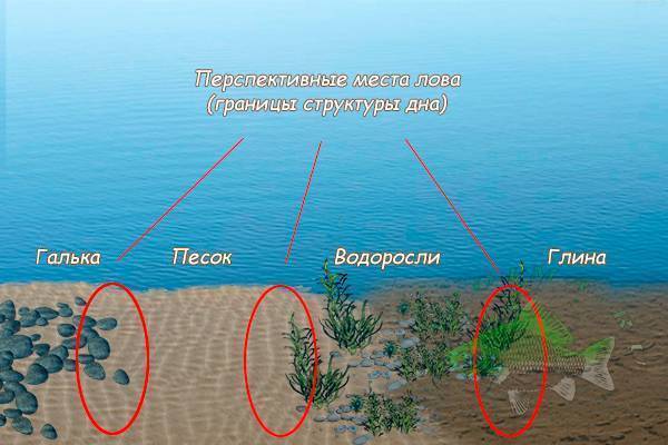 Хотелось бы остановить внимание на том, а что такое “перспективное место для ловли”? Замечено, что донная рыба предпочитает те участки дна, где имеются какие-то выраженные неоднородности. Это ямы, перепады глубин, уступы на склонах, границы галечного дна с осадочным дном, осадочного дна с водорослями, открытые участки дна среди водорослей и т.д