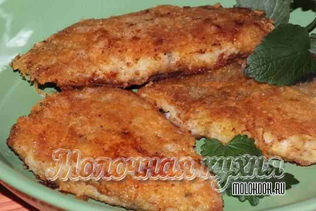 Кусочки судака требуется натереть солью и другими специями. Панировку насыпать в плоскую тарелку, обмакнуть в ней каждый стейк со всех сторон, лучше это сделать дважды (для сохранения сока внутри).