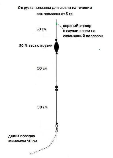При медленном течении дробинки с разным весом распределяют с убыванием массы равномерной цепочкой от поплавка к подпаску, соблюдая расстояние до 30 см.