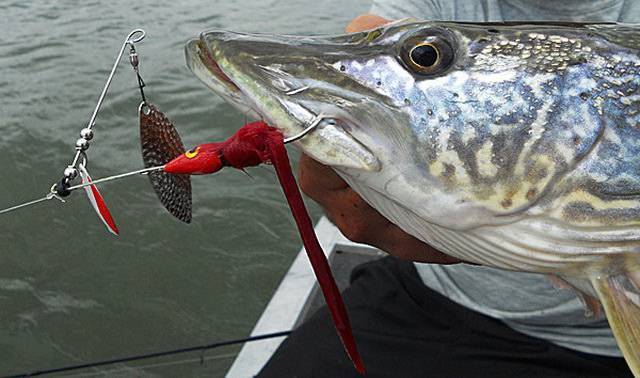 Специфической щучьей приманкой является также спиннербейт, который сочетает вращающейся лепесток, закрепленный на коромысле, с спрятанным в мохнатой «юбке» крючком. Спиннербейтом облавливают мелководье и места среди травы.