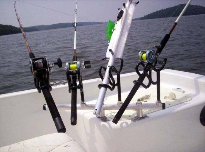 Лодку понадобиться оборудовать держателями удилищ, которые чаще изготавливают самостоятельно из пластиковых сантехнических труб, хотя их можно приобрести в любом рыболовном магазине. В надувной лодке держатели приклеивают к бортам, а на деревянной либо металлическом плав средстве крепят саморезами, болтами с гайками.