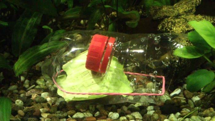 Ловушка для улиток подразумевает использование определённой приманки. Эти виды моллюсков не останутся равнодушными к обычному листу салата, слегка подпорченной кожуре банана, ломтику огурца или кабачка. Заготовку можно поместить на дно аквариума, а спустя некоторое время извлечь его вместе с улитками. Ловушку можно сделать более сложной и эффективной, если поместить приманку в какой-нибудь ёмкости. Такой способ исключит падение улиток в момент извлечения салатного листа или другого вида лакомства из аквариума.