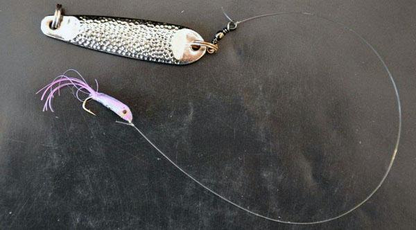 - Тандем с блесной или балдой – на конце основной лески привязывают тяжелую вертикальную блесну, а в 20-30 см от нее делается петля, к которой крепят 10-15-ти сантиметровый поводок с пыздриком;