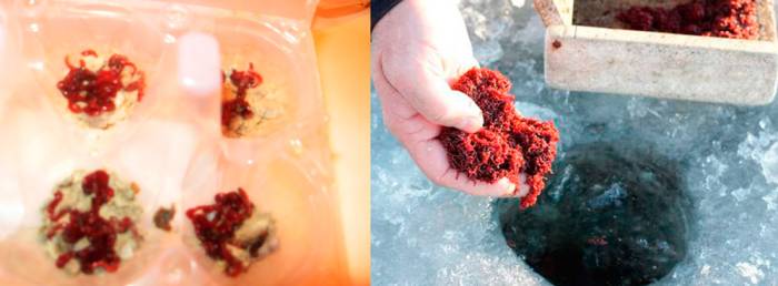 - Рецепт №2. В этой прикормке используется мотыль, который также смешивается с панировочными сухарями. Впоследствии, на рыбалке, из этой смеси делаются шарики и подбрасываются в лунку.