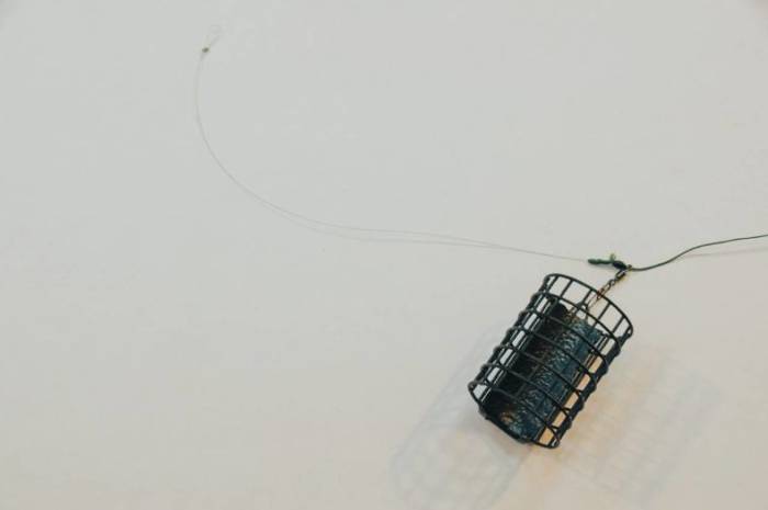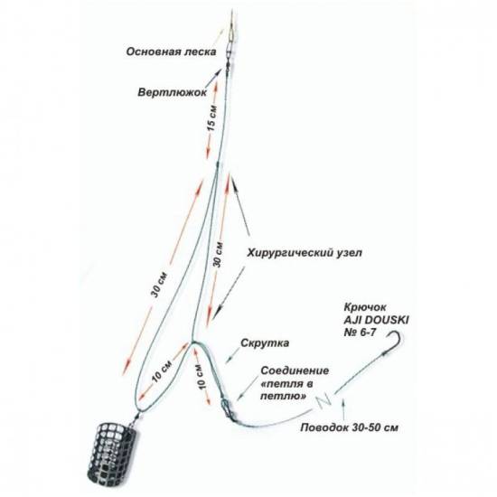- на леске делают петлю размером в 30 см, её разрезают на два конца в соотношении 2:1, тут уже на длинный конец при помощью вертлюжка крепят поводок с крючком, а на короткий – кормушку.
