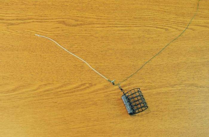 - на конце лески вяжется петля, размера достаточно в 4-5 см, на 30 см выше делается ещё одна, уже побольше, в маленькую вставляют поводок с крючком, к большой крепится кормушка;