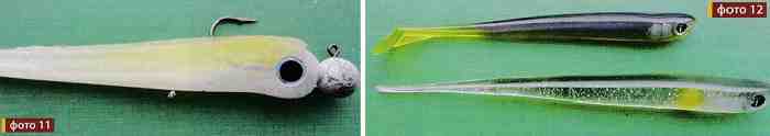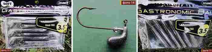 И у обеих силиконовых приманок, очень похожих друг на друга, имеются небольшие отличия, что, однако, в корне меняет подход к использованию этих Gastronomic Baits. Получается, что каждая из приманок как бы дополняет друг друга. И если верхняя на фото 12 приманка наиболее эффективна при горизонтальных проводках, то нижняя показывает наибольшую привлекательность уже при вертикальных перемещениях.
