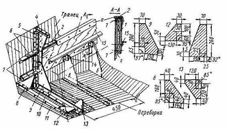 Замена транца на «Прогресс-4» очень трудоемкий процесс. Необходимо вывернуть все винты, которые крепят обе части транца. Далее необходимо высверлить заклепки для того, чтобы снять рецесс и после снять доску. Срубать заклепки крайне не рекомендуется, т.к. отверстия при этом расширяются (принимают форму эллипса) и новая заклепка на этом месте уже не сможет гарантировать полную герметичность. Винты желательно устанавливать на нетвердеющий герметик. Можно заменить на «Прогрессе» транец срезав кницу, подобравшись к ней через кормовой рундук. Плюсы: высверливаем меньше заклепок. Минусы: необходимость восстановления срезанной кницы. Если транец «Прогресса-4» в хорошем состоянии его можно усилить, сделав связку с другими панелями лодки – днищем, переборкой и бортами. Транцевую доску желательно изготовить новую из доски толщиной 28 мм и оклеить с обеих сторон бакелизированной фанерой или другим материалом. По горизонтальным кромкам прострогать пазы 42×4 мм под полки угольников 7, через которые доска будет крепиться к транцу. Все детали выполняются из дюраля. Перед монтажом нужно снять верхнюю накладку «а», три нижние кницы «б» и «в», снять с одной стороны боковую обделку выреза под мотор. Для усиления штампованной накладки «а» к верхнему угольнику 7 следует приклепать полосу 2. Угольники 7, 10, 11 крепятся к обшивке транца и бортам алюминиевыми заклепками Ø5 шагом не более 400 мм, остальные угольники — 4-миллиметровыми заклепками шагом 40-50 мм. Нижний угольник 7 предварительно соединяется с горизонтальным ребром «г» заклепками Ø4 шагом 50 мм. Транцевая доска крепится 36 болтами М8х70, которые ставятся по верхнему и нижнему краям доски, затем через угольник 15, коротыши 14 и несколько штук на концах доски.