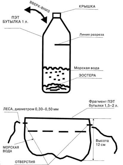 Для этого непростого занятия, заготовки червей – нереисов, придется взять уже хорошо знакомый нам шпатель с фиксирующим шнуром на ручке. Найдя многочисленную колонию мидий на волнорезе или подводной части пирса вам требуется также поддеть под самый низ шпателем (обязательно поднимая вместе с мидиями и субстрат, на котором они прикреплены) моллюсков и перевернуть их лицевой стороной вниз. На нижней их части, то есть на субстрате вы должны увидеть шевелящихся многощетинковых червей зеленого цвета длиной 2-4 см и толщиной 1,0-1,5 мм. Часто местные рыболовы, заготавливающие подобным образом нереисов, просто складывают мидии с субстратом, содержащем червей сначала в пластиковый пакет, а уже потом, на пирсе раскладывают всю массу на бетоне и выковыривают «добычу». Вам же гораздо целесообразнее поступить следующим образом. При переборке отсоединенных от бетонного основания волнореза мидий, придется найденных нереид складывать в повешенную на шею пластиковую емкость с морской водой, а моллюсков не выбрасывать как бесполезный мусор обратно в море, а кидать их целенаправленно в место предполагаемой рыбалки. Например, если вы нашли прекрасное место, где расположена большая колония мидий в зарослях зостеры, то, скорее всего это и будет место вашей будущей рыбалки, а заброшенные на правильном расстоянии от волнореза моллюски, сыграют роль прикормки перед предстоящим ужением. Таким образом, ловят рыбу местные рыболовы-любители, но они перед закидыванием мидий в место ужения, всегда их размалывают на пирсе камнем. Размолотые мидии, распространяя специфический аромат моллюска, основного корма зеленушек, морских карасей и бычков, привлекают их на место через 20-30 минут после заброса.