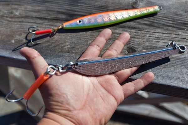Эта приманка сочетает в себе горизонтальную блесну, сквозь тело которой пропускается леска и тройник, который крепится на ее конце.