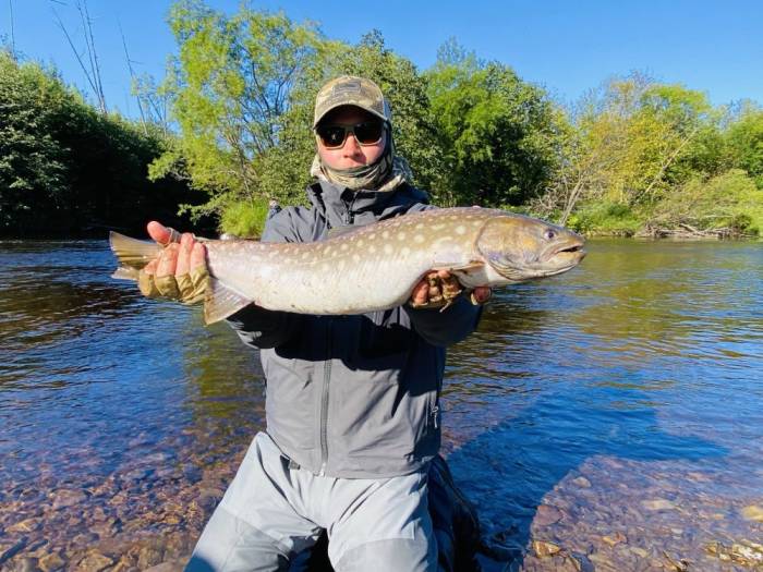 Долго я прокручивала в голове случившееся: то ли таймень приманку плохо взял, хотя по поведению не чувствовалось, то ли таранил валун, чтобы сбросить приманку, то ли я перестаралась со второй подсечкой. Голову сломала, но так и не разобралась. Вспомнились слова Димы Калашникова: «Сахалинский таймень – тонкая материя». А река как-то почувствовала мои расстройства – и с того же плёса одарила меня прекрасной кунджей на четыре кило. Малое утешение, хотя фото получилось очень красивое.