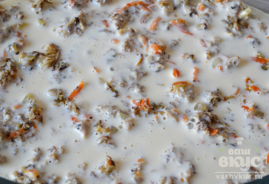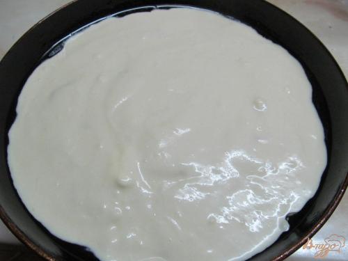 - Осталось добавить слои в миску по привычной схеме: тесто-начинка-тесто.