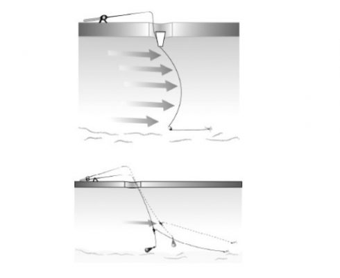 Практически приходится подбирать вес грузила таким образом, чтобы оно фиксировалось на дне, а воздействие течения почти полностью компенсировало бы его массу